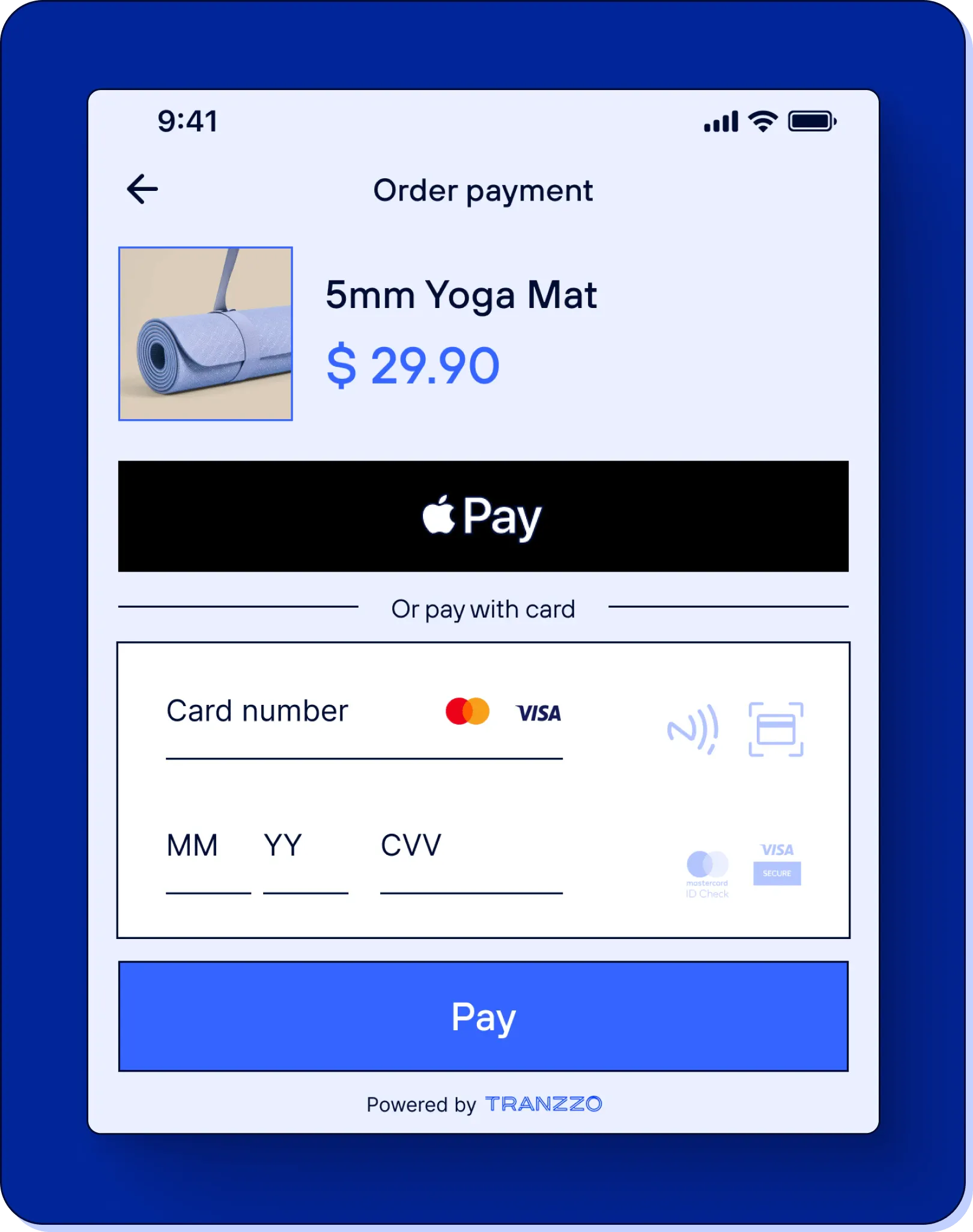 При переходе к оплате открывается интерфейс со встроенным платежным SDK от Tranzzo.