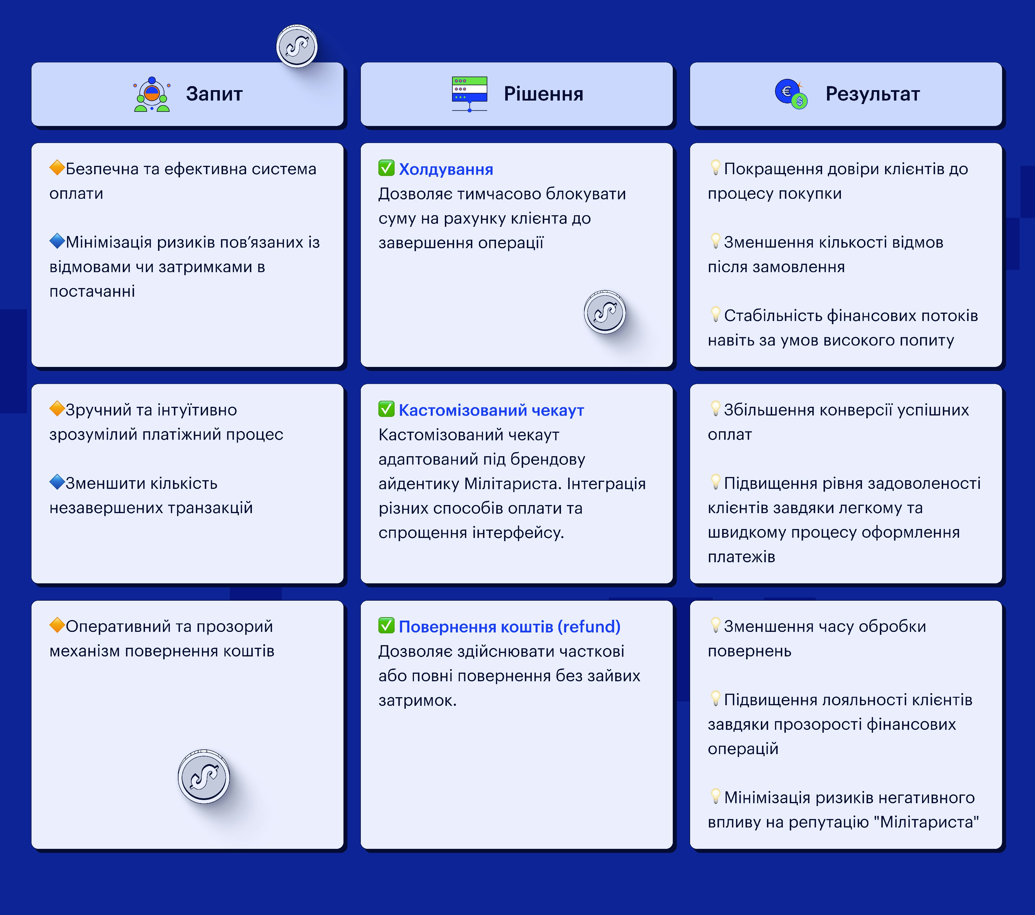 Нижче ми більше детально розкажемо про інтегровані нами технічні зміни у платіжну інфраструктуру Мілітариста.