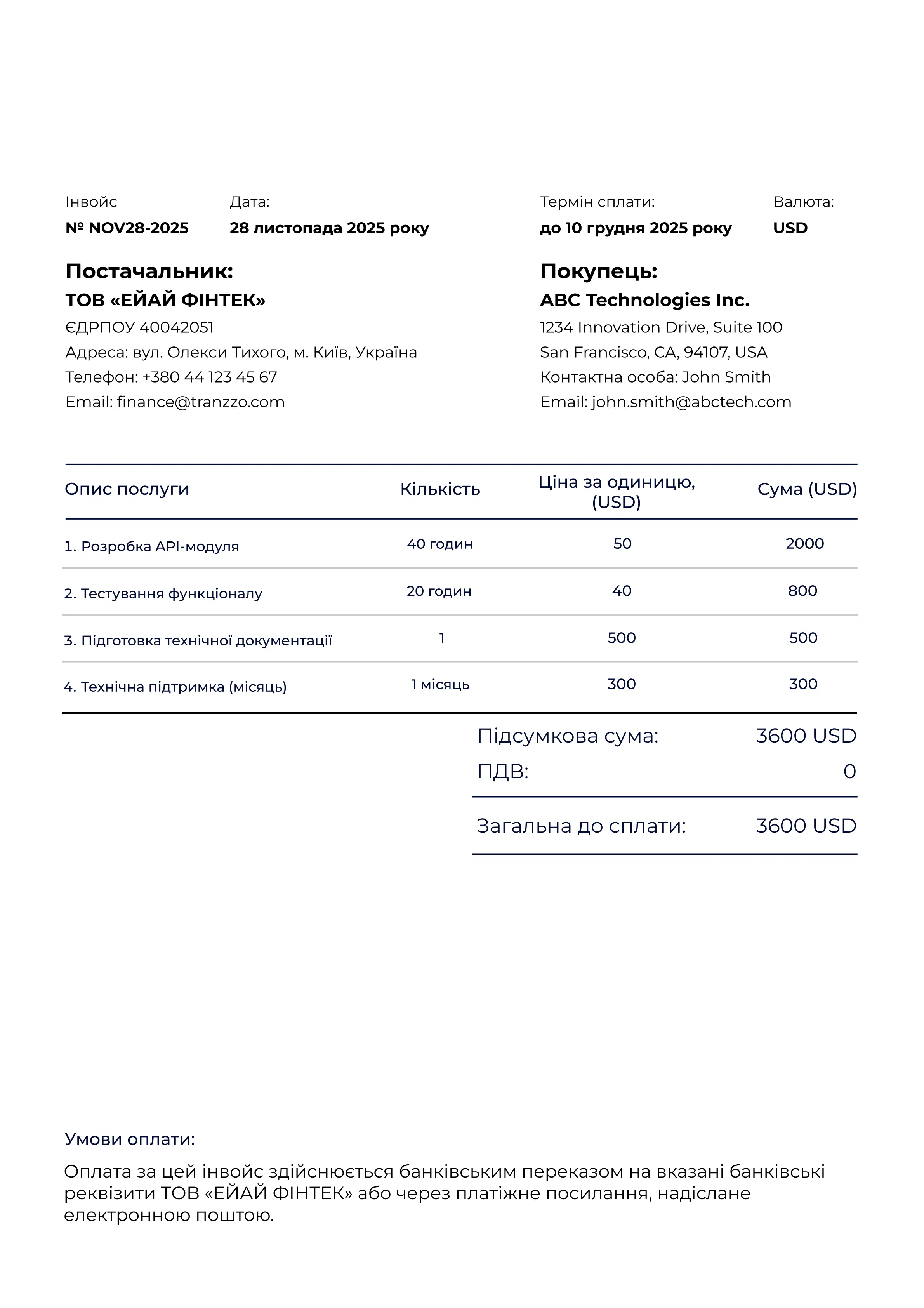 - Платіжні посилання-інвойси через систему автоматизації розрахунків (Tranzzo, LiqPay тощо).