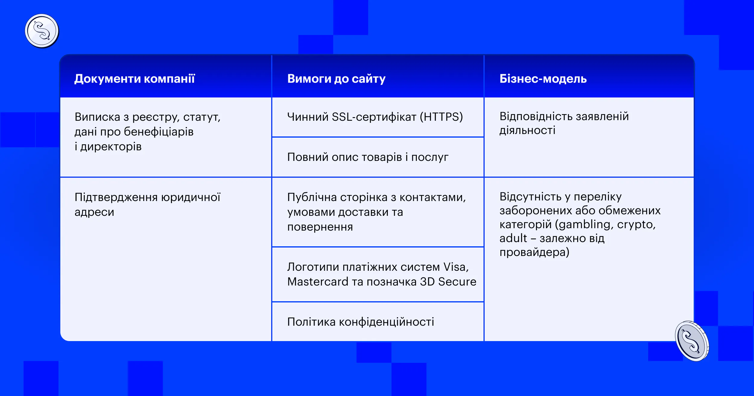 Процес прискорюють повний пакет документів, коректно оформлений сайт і прозора бізнес-модель. Сповільнюють – розбіжності в даних, відсутні сторінки на сайті або категорія підвищеного ризику.