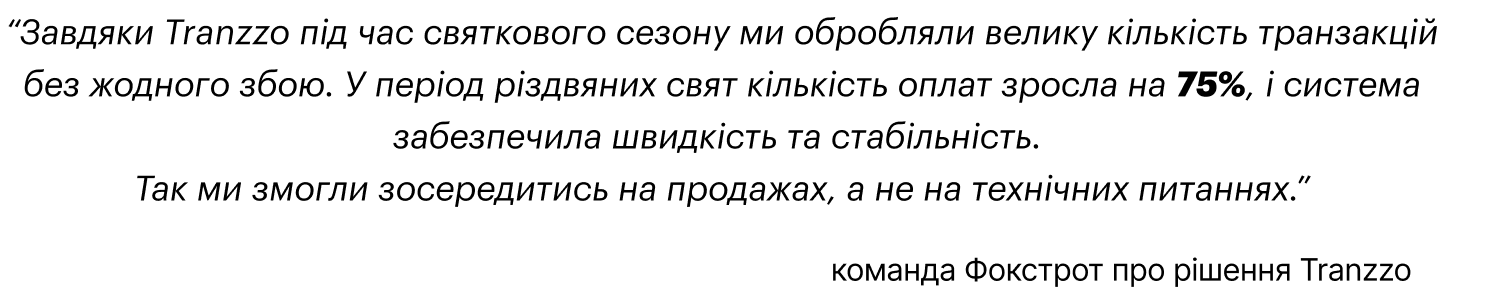 Співпраця з Фокстрот – це наш приклад довгого та, найголовніше, успішного партнерства. За шість років нашої спільної роботи платіжна інфраструктура Фокстрот стала динамічною системою, що гнучко реагує на виклики: від сезонних сплесків продажів до нових сценаріїв оплати.