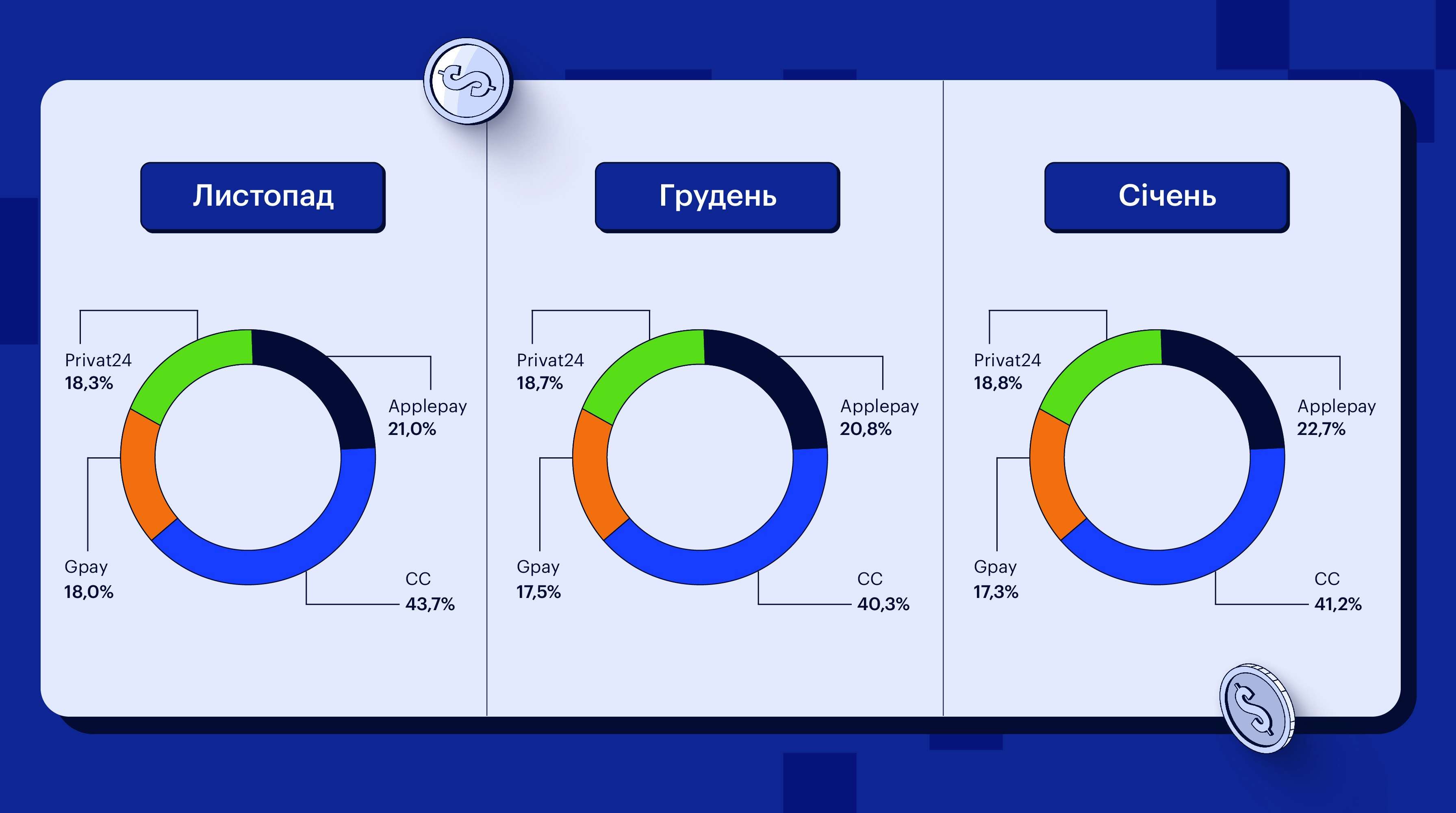 Нижче – результати впровадження наших рішень у вигляді показников частки кожного платіжного методу у святковий період з листопаду 2024 до січня 2025.